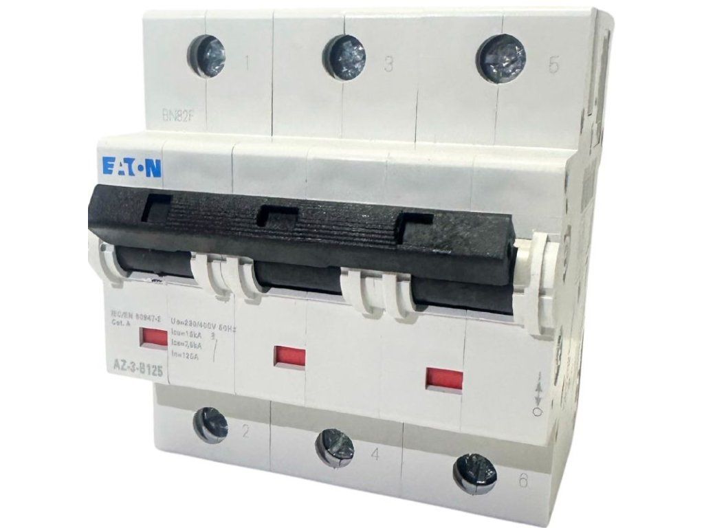Istič Eaton 174514 trojpólový, AZ-3 charakteristika B, skratová odolnosť 15 kA. Počet modulov: 4,5. S možnosťou pripojiť pomocné a signalizačné kontakty, podpäťové a vypínacie spúšte.Dodatočné parametre