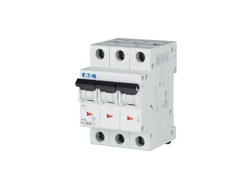 Istič Eaton 286593 trojpólový, PL6 charakteristika B, skratová odolnosť 6 kA. S možnosťou pripojiť pomocné a signalizačné kontakty, podpäťové a vypínacie spúšte.Dodatočné parametre