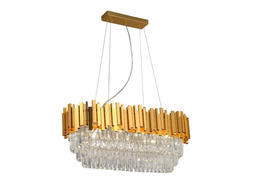 Toto výnimočné svietidlo spája moderný štýl s precíznym remeselným spracovaním. Telo svietidla je vyrobené z kvalitného kovu v elegantnom odtieni zlatej farby, pričom jeho povrch je bohato zdobený jemne brúsenými kryštálmi, ktoré nádherne lámu svetlo a vytvárajú jedinečný svetelný efekt.