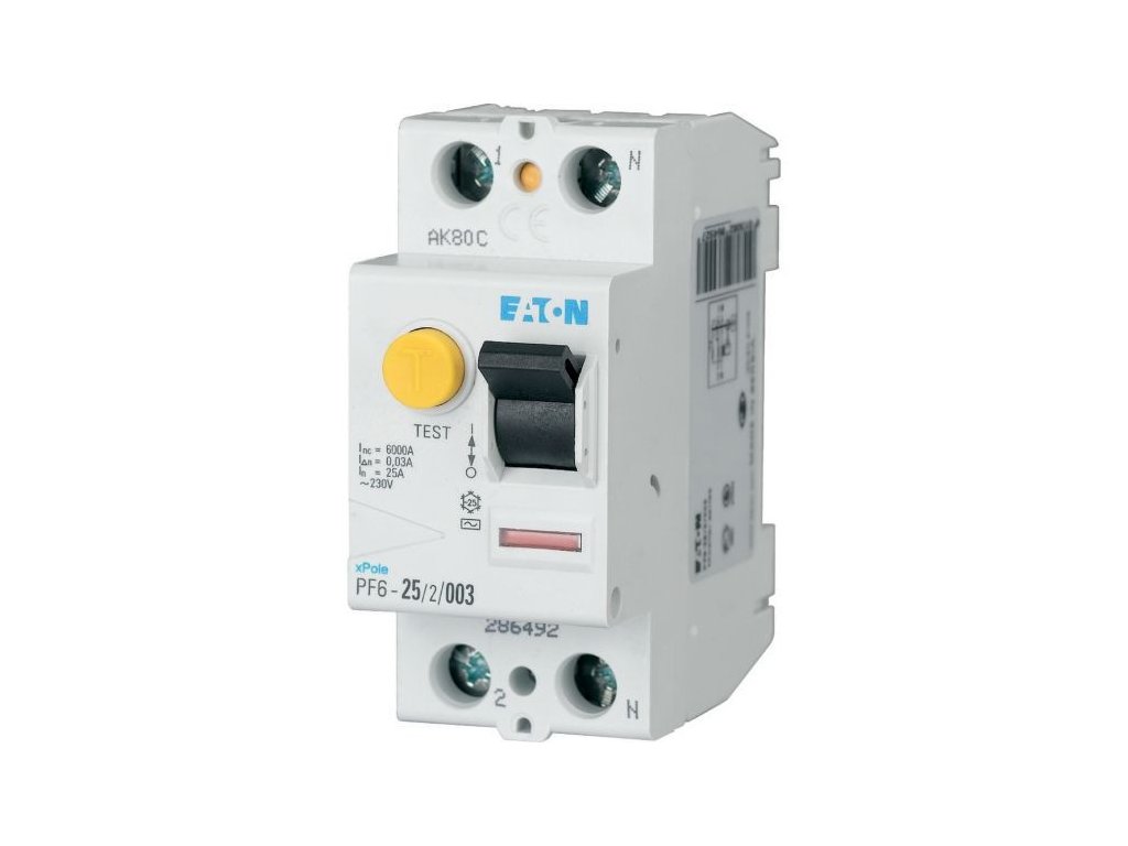 Prúdový chránič Eaton PF6, 2-pólový, typ AC (citlivý na striedavé reziduálne prúdy). S možnosťou pripojiť pomocné kontakty Z-HK, N pól na pravej strane. Menovitá skratová odolnosť 6kA.Dodatočné parametre