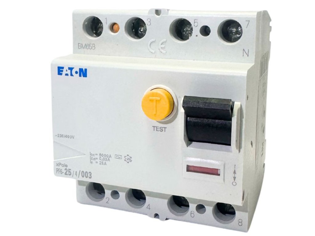 Prúdový chránič Eaton PF6, 4-pólový, typ AC (citlivý na striedavé reziduálne prúdy). S možnosťou pripojiť pomocné kontakty Z-HK, N pól na pravej strane. Menovitá skratová odolnosť 6kA.Dodatočné parametre