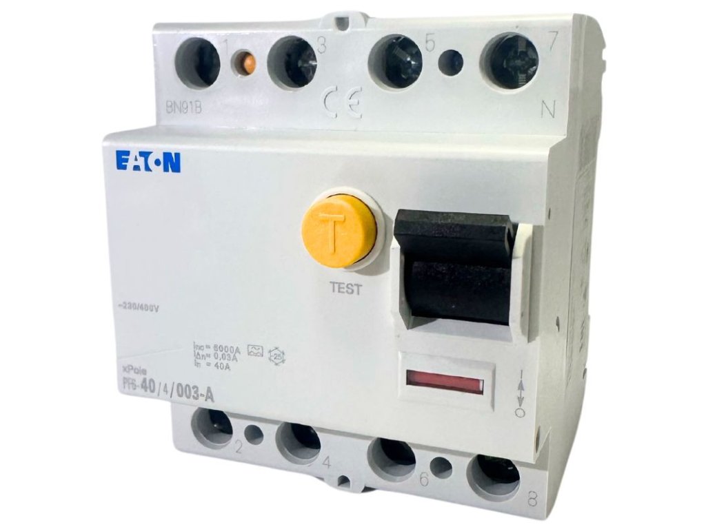Prúdový chránič Eaton PF6, 4-pólový, typ A (citlivý na striedavé aj pulzujúce jednosmerné reziduálne prúdy). S možnosťou pripojiť pomocné kontakty Z-HK, N pól na pravej strane. Menovitá skratová odolnosť 6kA.Dodatočné parametre