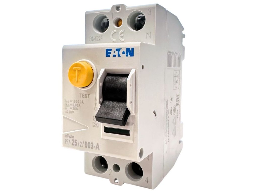 Prúdový chránič Eaton PF7, 2-pólový, typ AC (citlivý na striedavé reziduálne prúdy). S možnosťou pripojiť pomocné kontakty Z-HK, N pól na pravej strane. Menovitá skratová odolnosť 10kA.Dodatočné parametre