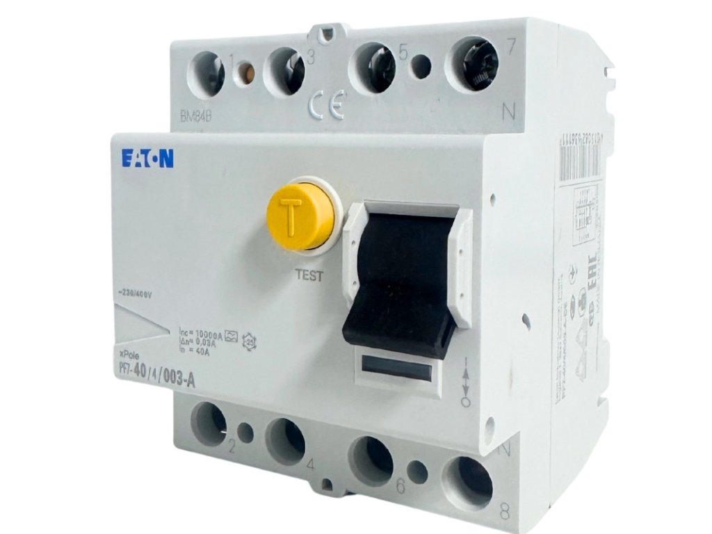 Prúdový chránič Eaton PF7, 4-pólový, typ AC (citlivý na striedavé reziduálne prúdy). S možnosťou pripojiť pomocné kontakty Z-HK, N pól na pravej strane. Menovitá skratová odolnosť 10kA.Dodatočné parametre
