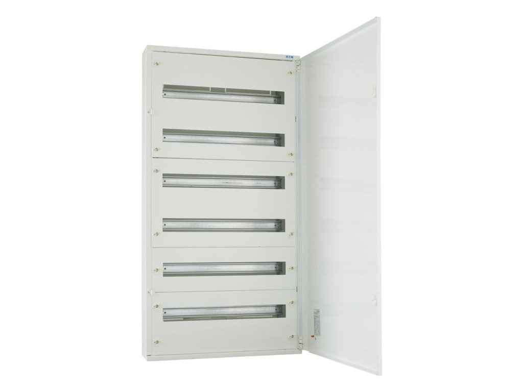 Veľkoobsahová povrchová rozvodnica Eaton BF-O-6/144-C. 6-radová, 144 modulov (24 modulov v rade). Svorkovnica N+PE, 2x(2x25 mm² + 43x16 mm²). Stupeň krytia IP30. Trieda ochrany I. Dvere aj skriňa z oceľového plechu. Farba biela. Vyberateľný rám s prístrojovými lištami. Vzdialenosť medzi lištami 150 mm. Výška H 1050 mm.Dodatočné parametre