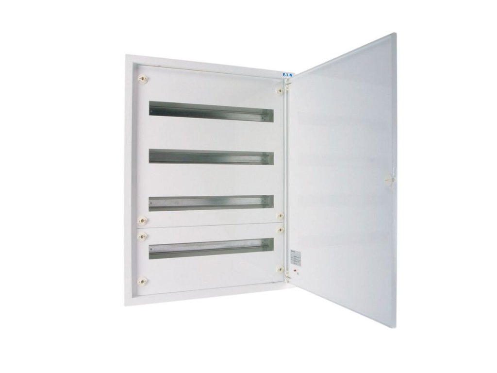 Veľkoobsahová zapustená rozvodnica Eaton BF-U-4/96-C. 4-radová, 96 modulov (24 modulov v rade). Svorkovnica N+PE, 2x(2x25 mm² + 43x16 mm²). Stupeň krytia IP30. Trieda ochrany I. Dvere aj skriňa z oceľového plechu. Farba biela. Vyberateľný rám s prístrojovými lištami. Vzdialenosť medzi lištami 150 mm. Výška H 770 mm, vnútorná výška H1 720 mm.Dodatočné parametre