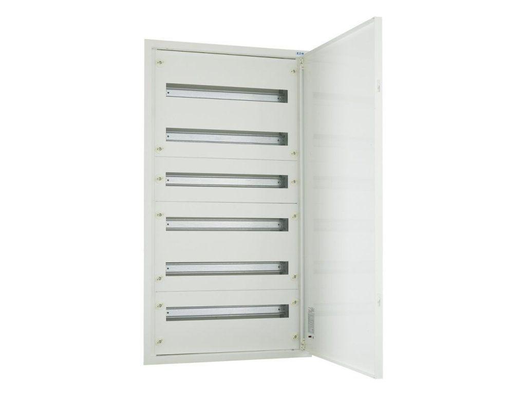Veľkoobsahová zapustená rozvodnica Eaton BF-U-6/144-C. 6-radová, 144 modulov (24 modulov v rade). Svorkovnica N+PE, 2x(2x25 mm² + 43x16 mm²). Stupeň krytia IP30. Trieda ochrany I. Dvere aj skriňa z oceľového plechu. Farba biela. Vyberateľný rám s prístrojovými lištami. Vzdialenosť medzi lištami 150 mm. Výška H 1070 mm, vnútorná výška H1 1020 mm.Dodatočné parametre