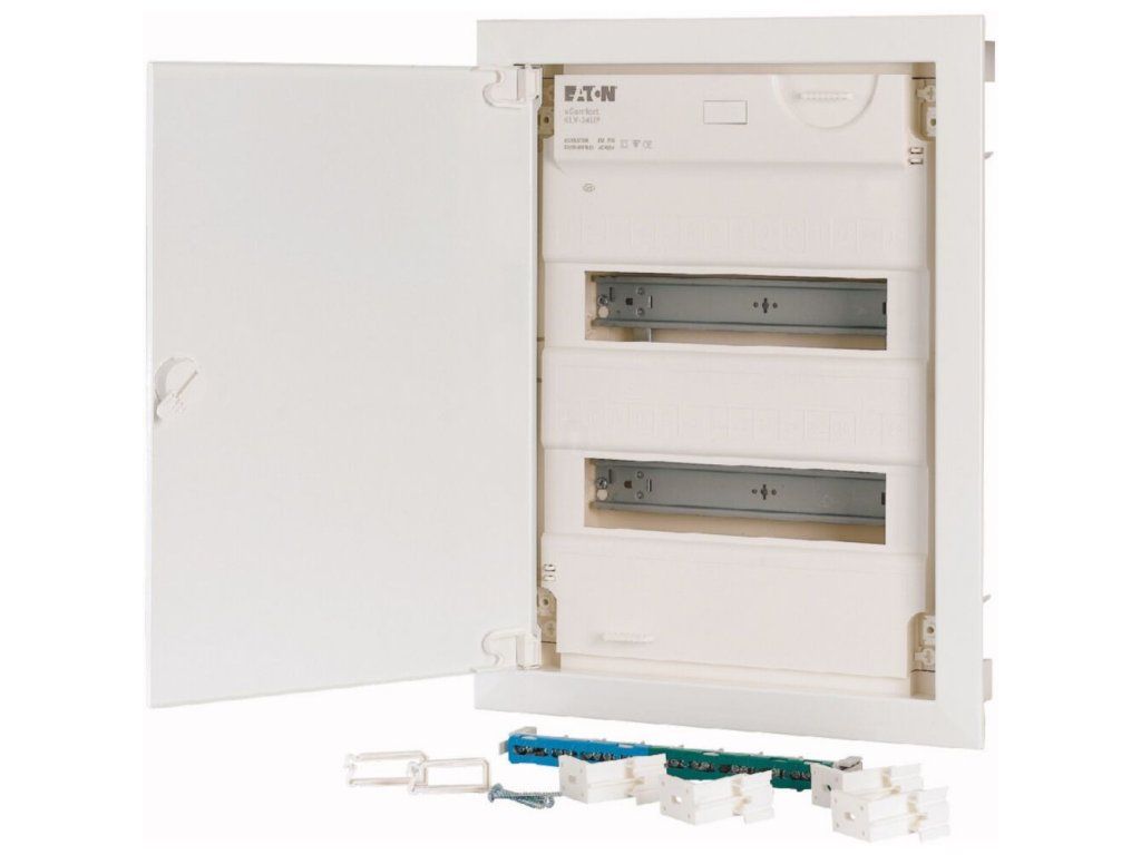 Rozvodnica zapustená Eaton 178816 KLV-24UPS-F, 2-radová, 24+4 modulov, stupeň krytia IP30. Plné dvierka z oceľového plechu. Rozmery 315 x 434 x 87,5 mm. Biela farba.Dodatočné parametre