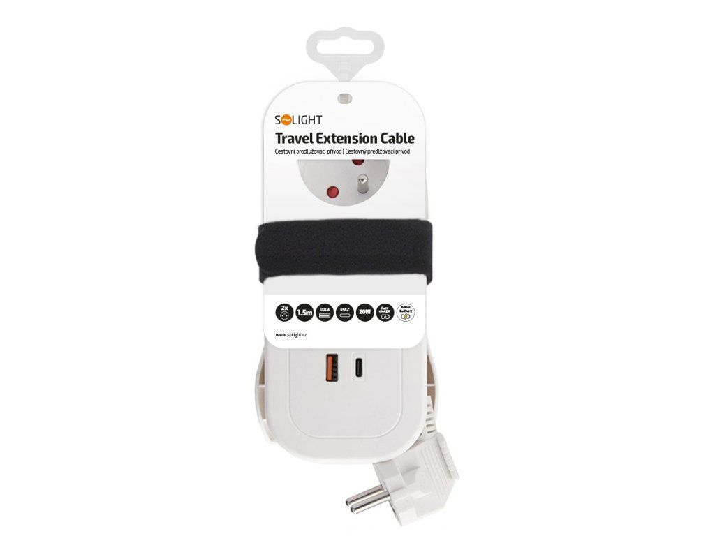 Tento cestovný predlžovací prívod Solight ponúka dve sieťové zásuvky 230 V a rýchlu USB-A + USB-C nabíjačku s výkonom až 20 W. Je ideálny na použitie doma, v práci aj na cestách, kde oceníte kompaktné rozmery, vysokú funkčnosť a praktické usporiadanie portov pre pripojenie viacerých zariadení naraz.USB-C s podporou Power Delivery a USB-A s Quick Charge zaisťujú rýchle a bezpečné nabíjanie telefónov, tabletov aj ďalšej elektroniky. Integrovaný priestor na navinutie kábla uľahčuje skladovanie a prepravu, najmä v batožine alebo batohu. Elegantné biele prevedenie dopĺňa uhlová vidlica pre pohodlné pripojenie aj v tesných miestach. Predlžovací napájací kábel s dvoma zásuvkami a USB rýchlonabíjačkou. Skladný, výkonný, ľahko prenosný. Ideálny na nabíjanie elektronických zariadení na cestách. 2x 230V/16A, max. 3680W, detské poistky 1x USB-C, 5V/3,4A, max. 17W 2x USB-A, 5V/3,4A, max. 17W PVC kábel 1.5m, H05VV-F, 3 x 1,0 mm2 uhlová vidlica s nízkym profilom od steny, sklopný úchyt pre ľahké vytiahnutie zo zásuvkyDodatočné parametre