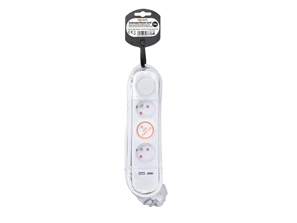 Solight 3z predlžovací prívod s USB A+C nabíjačkou 2,4A, 2m, 3 x 1mm2, biely, vypínač