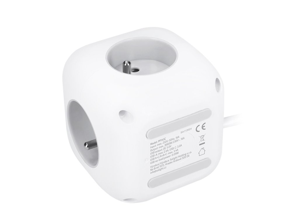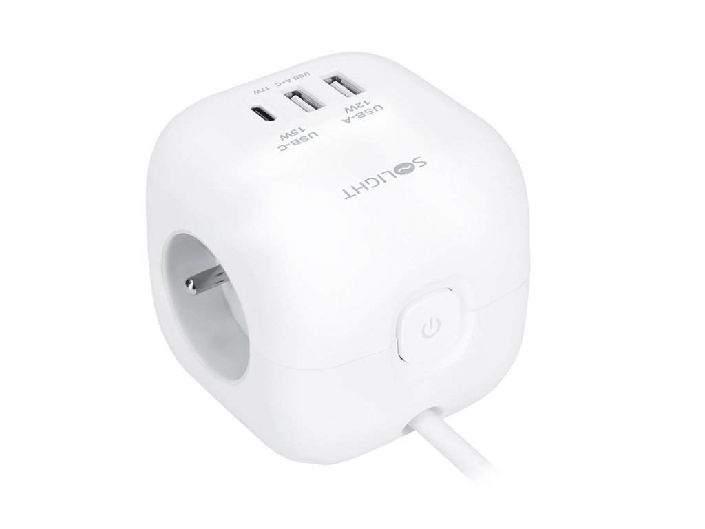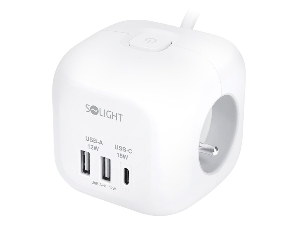 Solight 3z + USB A+C predlžovací prívod - kocka, 2m, 3 x 1mm2, biely, vypínač