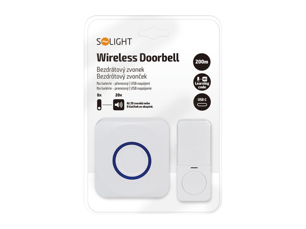 funkcia" Learning code "umožňuje spárovanie niekoľkých zvončekov alebo tlačidiel do jednej skupiny k jednému zvončeku môže byť spárované max. 8 tlačidiel jedno tlačidlo môže byť spárované s max. 20 zvončeky, na každom zvončeku môže byť nastavená iná melódia 64 voliteľných melódií, obojsmerné vyhľadávanie LED indikátor zvonenia na zvončeku aj tlačidle tlačidlo s krytom na menovku, vodotesná a prachotesná ochrana IP56 uchytenie tlačidla pomocou montážnych otvorov alebo samolepiacej podložky USB-C vstup pre alternatívne napájanie (USB-C neslúži na dobíjanie batérií) náhradné tlačidlo Solight č. 1L69TDodatočné parametre