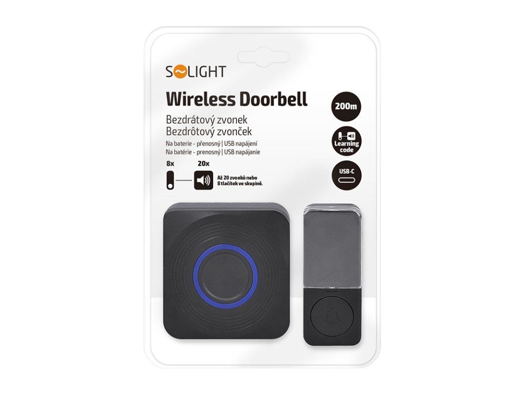 Solight bezdrôtový zvonček, batériový + USB, 200m, čierny, learning code