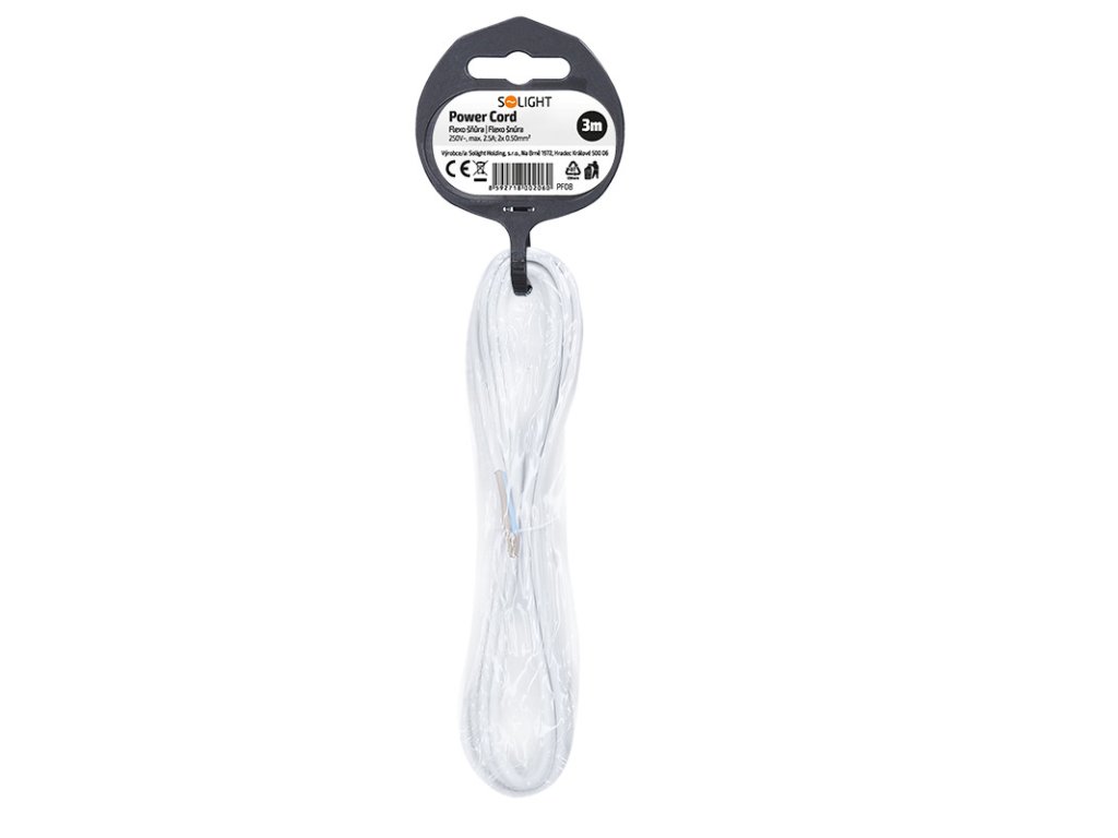 Prívodný PVC kábel s voľnými vodičmi umožňuje pripojenie priamo do spotrebiča alebo k pohyblivej zásuvke. Vodiče sú zo splietaných medených drôtikov s medenými krimpovanými koncovkami, uľahčujúce montáž do svorkovnice. Určené pre vnútorné použitie, stupeň krytia IP20. prierez vodičov: 2 x 0,50mm2 typ kábla: H03VV-F2 plochá vidlica farba: biela dĺžka: 3mDodatočné parametre