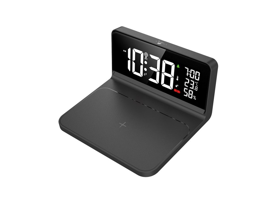 bezdrôtová nabíjačka nabíja všetky zariadenia, ktoré vyhovujú štandardu bezdrôtového nabíjania Qi výkon bezdrôtového nabíjania je max. 10W vysoké rozlíšenie LCD displeja kalendár do roku 2099 voliteľné zobrazenie času 12/24h denný a Po-Pia budík s funkciou opakovaného budenia jednotky teploty v °C/°FDodatočné parametre