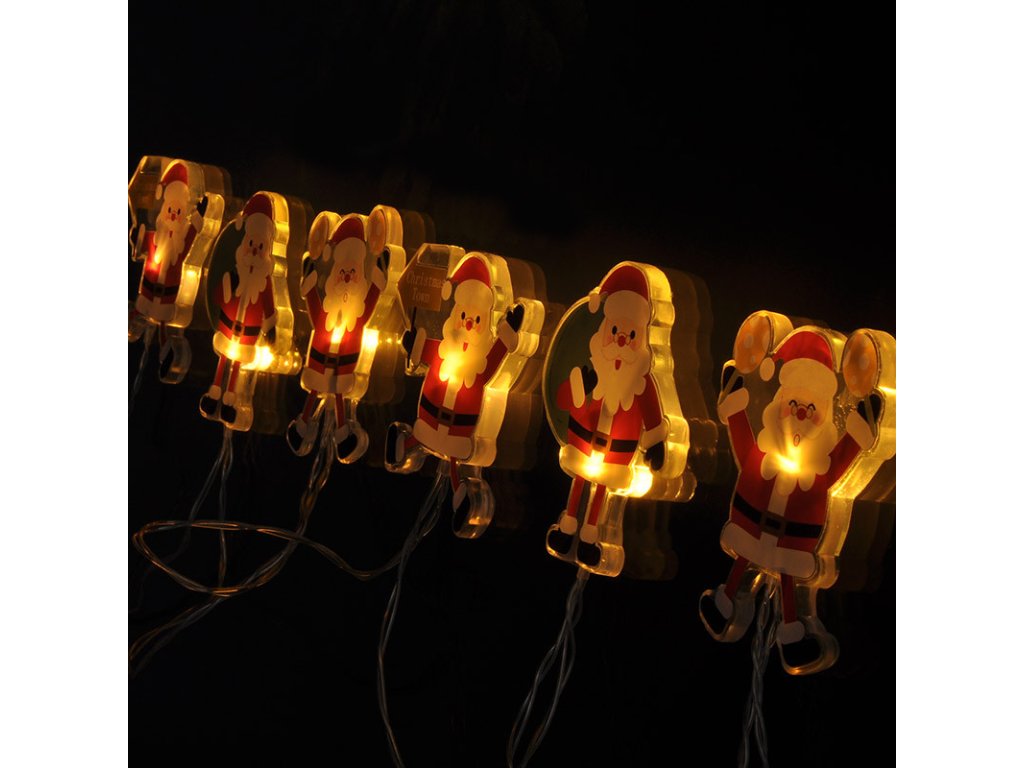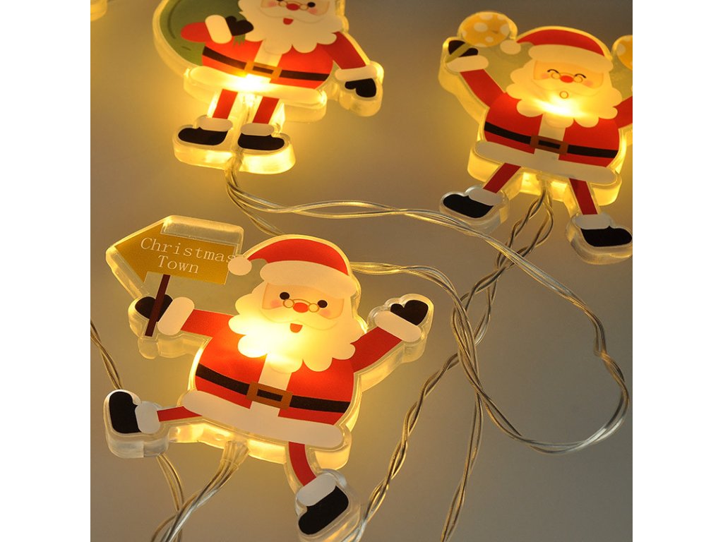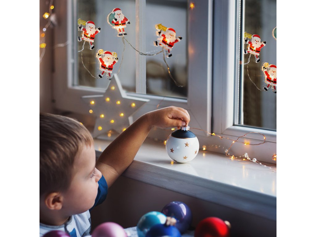 LED reťaz Santa - samoprísavná okenná dekorácia počet LED diód: 6 farba svetla: teplá biela (žltá) napájanie: 2xAA batérie (nie je súčasťou balenia) výdrž batérií: cca 100hod. (v závislosti na kvalite batérii) trieda ochrany: IP20 (vnútorné použitie) dĺžka: 1,2m veľkosť Santy: 8cmDodatočné parametre