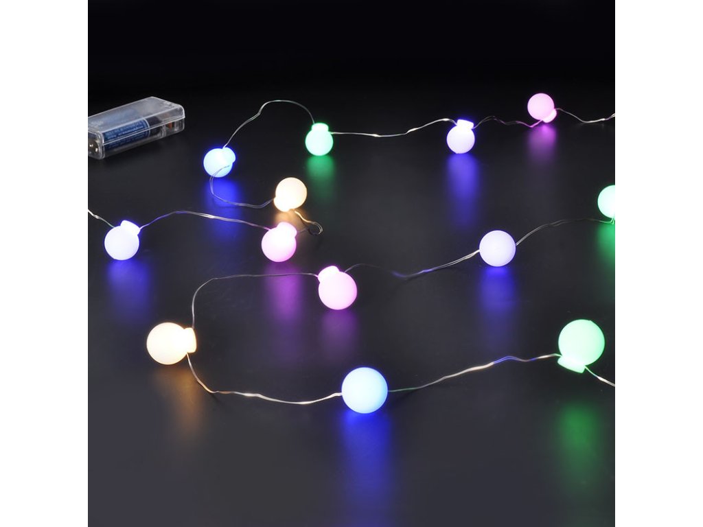 Osvieťte svoj interiér hravou reťazou s 20 farebnými LED guľôčkami. Táto 2 m dlhá reťaz ponúka farebné osvetlenie ideálne do detskej izby, na parapet alebo okolo vianočného stromčeka. Každá z guľôčok svieti inou farbou a spoločne vytvárajú veselú sviatočnú atmosféru. Napájanie zabezpečujú dve batérie AA (nie sú súčasťou balenia) a ich životnosť je približne 100 hodín. Vďaka 0,3 m dlhému napájaciemu káblu je manipulácia jednoduchá a flexibilná. Režimy zapnutia a vypnutia umožňujú jednoduché ovládanie. Reťaz je určená na použitie v interiéri (IP20) a je vyrobená z kovu a plastu. Vhodná nielen na Vianoce, ale aj na narodeninové oslavy, do detských izieb alebo na kreatívne zdobenie interiéru. vianočná dekoratívna reťaz s farebnými LED guličkamiDodatočné parametre