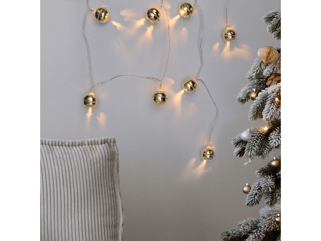 Vianočná reťaz so zlatými kovovými zvončekmi je nielen svetelnou dekoráciou, ale aj hravým prvkom, ktorý do interiéru prináša čaro tradičných Vianoc. Reťaz je vybavená 10 LED diódami s teplým bielym svetlom, ktoré jemne osvetľujú jednotlivé rolničky na dĺžke 1,5 metra. Kombinácia kovu a plastu zaručuje príjemný vzhľad a odolnosť. Napájaná 2× batériami AA (nie sú súčasťou balenia) ponúka približne 100 hodín svietenia. Napájací kábel má dĺžku 0,3 m. Reťaz má stupeň krytia IP20, vďaka čomu je vhodná na použitie v interiéri. Perfektne sa hodí na ozdobenie krbovej rímsy, vianočného venca alebo slávnostného stola. Vďaka vizuálnemu a zvukovému efektu sa stane výnimočným doplnkom vašej výzdoby. vianočná dekoratívna reťaz so zlatými rolničkami i a LED diódamiDodatočné parametre