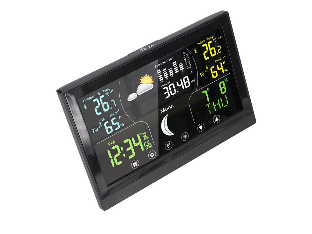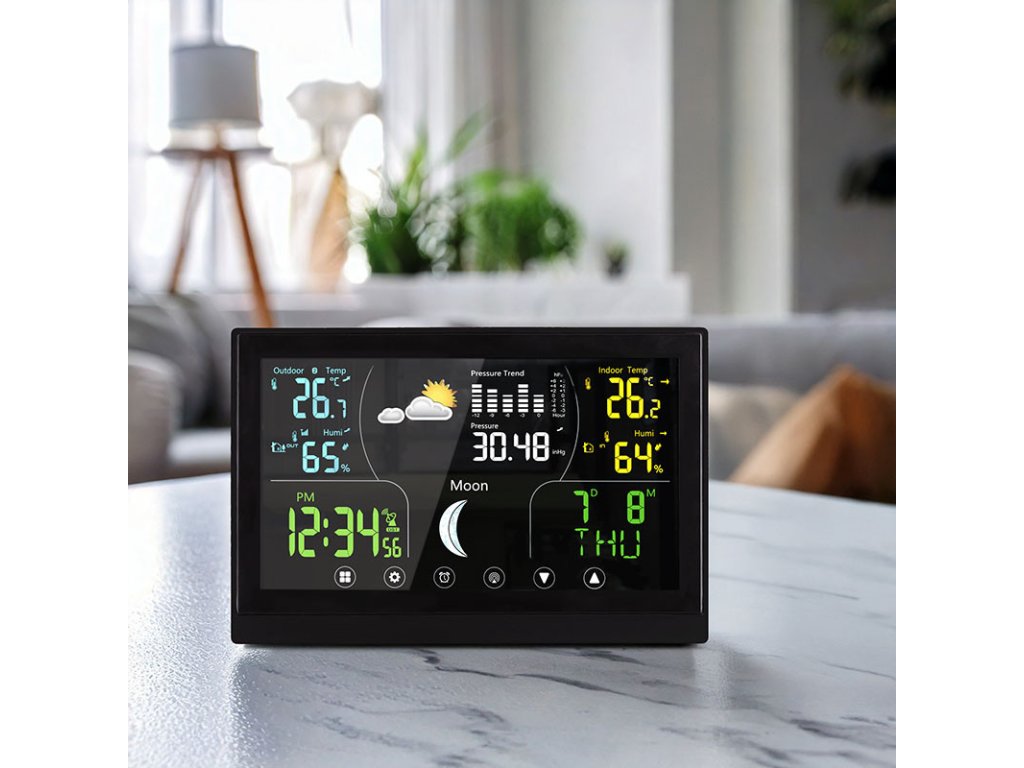 farebný VA displej s dotykovým ovládaním možnosť trvalého podsvietenia predpoveď počasia zobrazenie fáz Mesiaca barometer na meranie atmosférického tlaku záznam minimálnych a maximálnych hodnôt teplotná výstraha možnosť nastavenia jednotiek teploty (°C/°F) hodiny riadené DCF signálom funkcia budíka a opakovaného budenia kalendár a dátum korekcia nadmorskej výšky bezdrôtové čidlo s dosahom až 100m (súčasť balenia) možnosť pripojenia až 3 čidiel farba čiernaDodatočné parametre