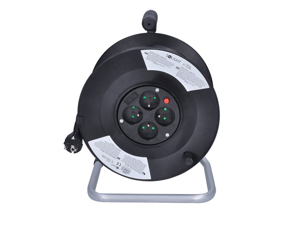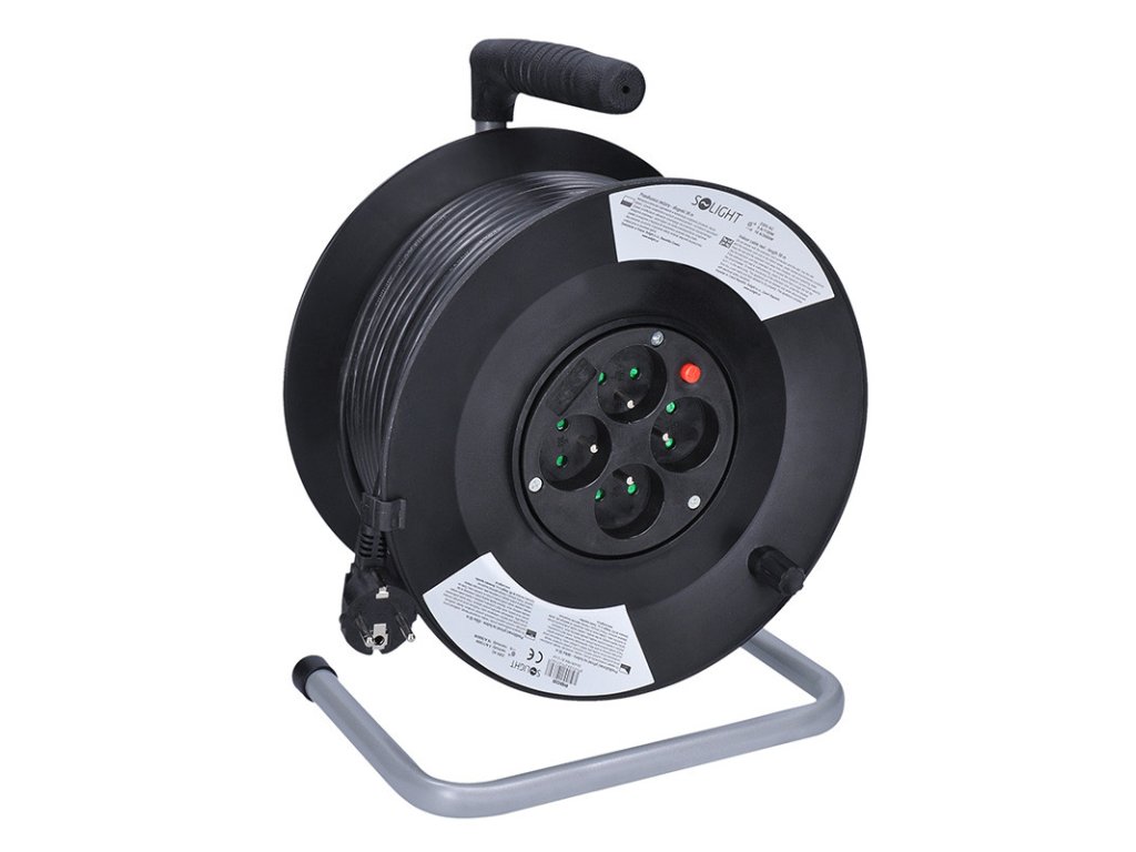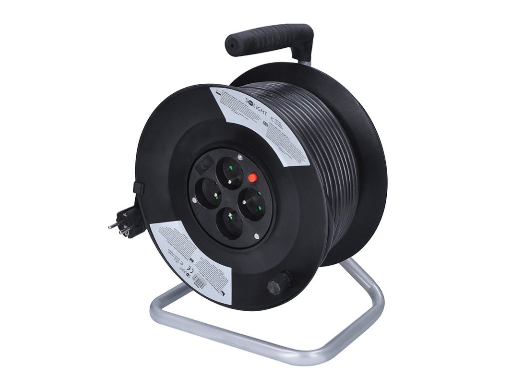 Solight predlžovací prívod na bubne, 4 zásuvky, 50m, čierny kábel, 3x 1,5mm2
