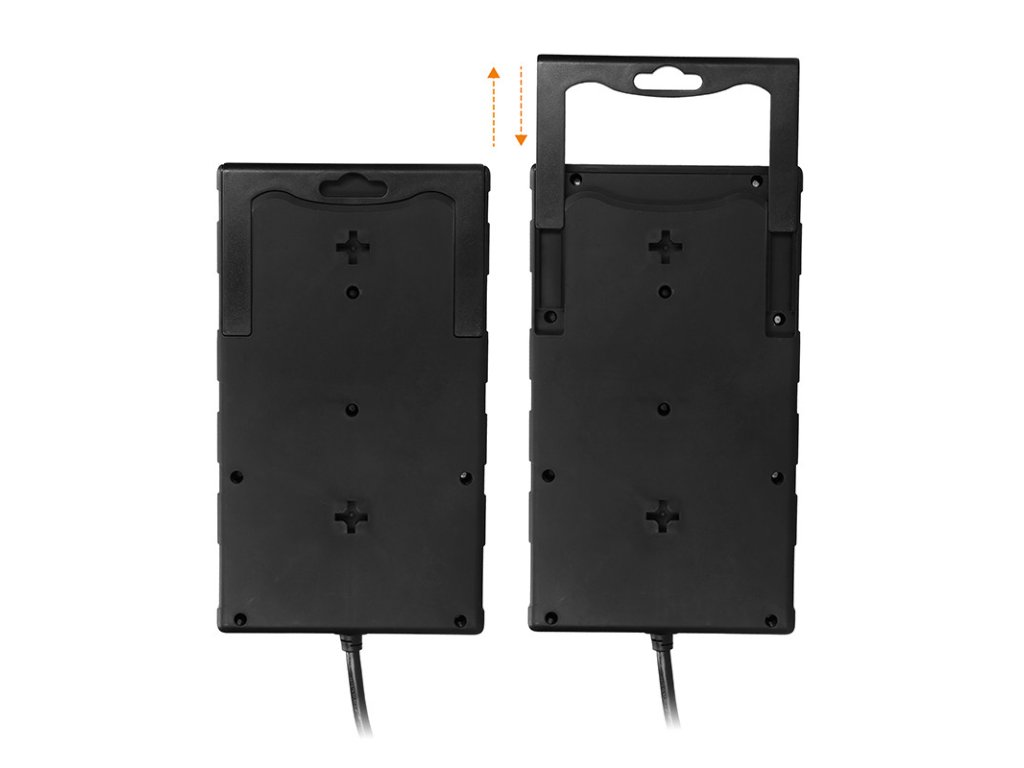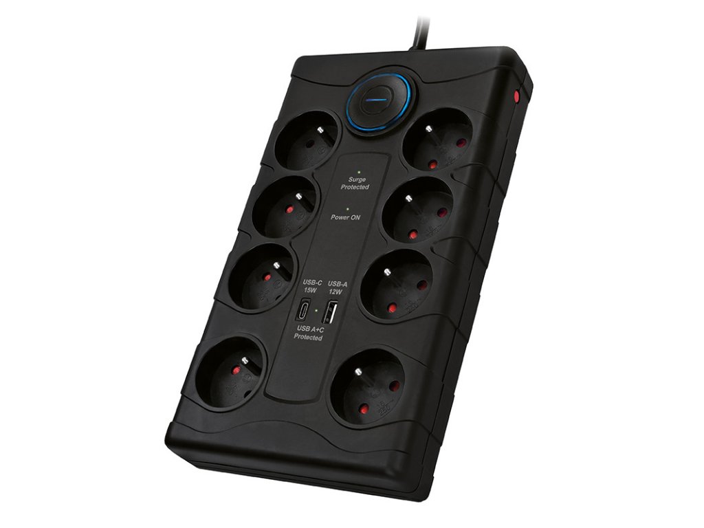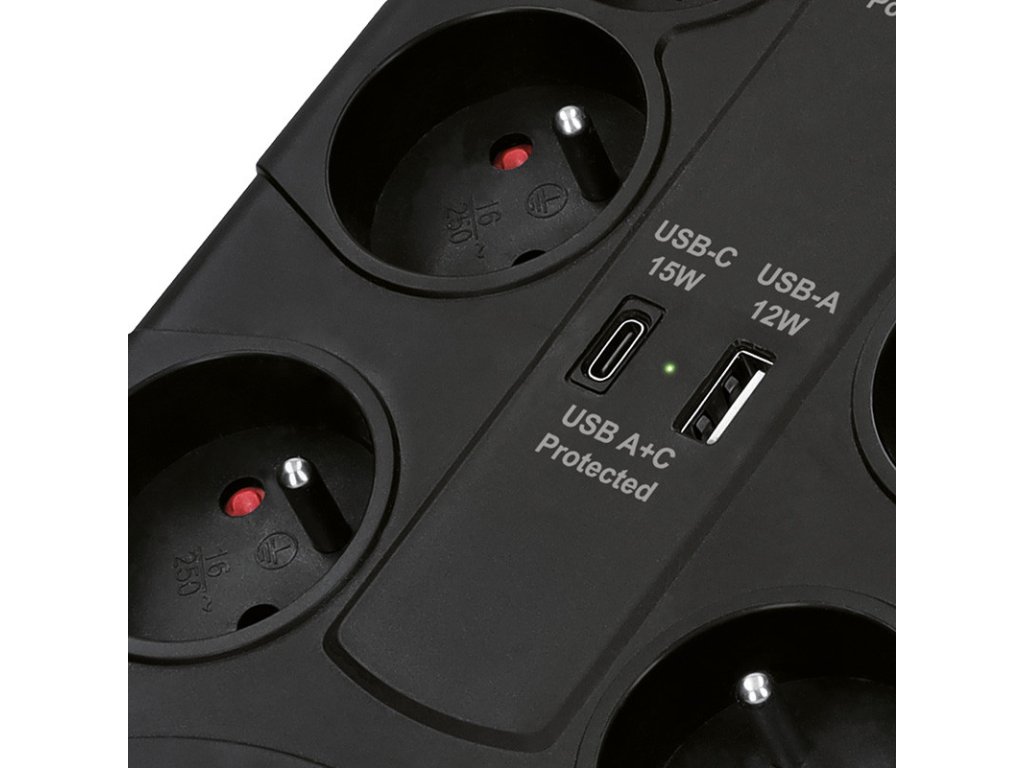 8 zásuviek 230V~16A s detskými poistkami 2 oddelené zásuvky pre veľké adaptéry resetovateľná tepelná poistka chráni pred preťažením pripojenými spotrebičmi veľký podsvietený vypínač ovláda elektrické zásuvky aj USB porty výsuvný držiak na usmernenie káblov, zavesenie alebo prenášanie montážne otvory na zadnej strane na pripevnenie k povrchu LED indikácia Prepäťová ochrana aktívna, Zásuvky 230V chránené, USB A + C porty chránené prepäťová ochrana Typ-3 (SPD Type-3) plná 3-pólová prepäťová ochrana všetkých vodičov L-N, L-PE, N-PE maximálne napätie: trvalé Uc = 275V, ochranná úroveň Up ≤ 2,2kV, kombinovaný impulz Uoc = 4kV maximálny prúd: menovitý IN = 16A, maximálny vybíjací IMAX = 6.5kA zvodový prúd: 1mA, doba odozvy: 20ns absorpcia tepelného rázu: 370J USB A+C nabíjačka, DC 5V, max. 3.4A, max. 17W USB A+C spoločne USB-A: 5V-2.4A, 12W samostatne USB-C: 5V-3A, 15W samostatne PVC kábel 2m, H05VV-F 3x1.5mm2, max. 3680W farba: čiernaDodatočné parametre
