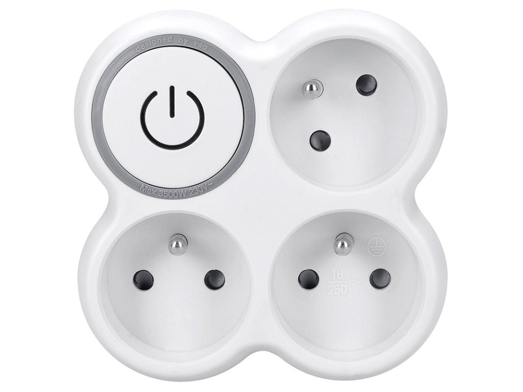 výstup 3x 10A, max. 3500W pootočená horná zásuvka veľký podsvietený vypínač detská poistka