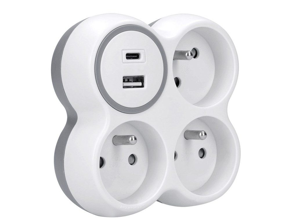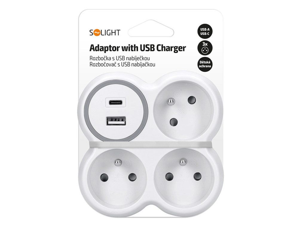 Solight rozbočovač, 3x 15A, USB nabíjačka A+C, biely-sivý