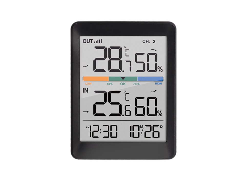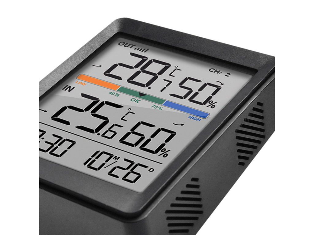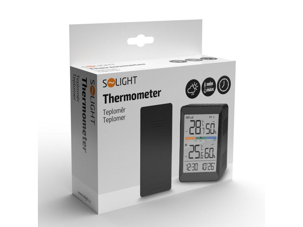 pamäť minimálnych a maximálnych hodnôt teploty a vlhkosti indikátor vývoja teploty a vlhkosti teplota v stupňoch °C/°F hodiny, budík, časový formát 12/24, rok 1 bezdrôtový senzor (súčasťou balenia) dosah až 60 m (bez prekážok) ukazovateľ vybitej batérieDodatočné parametre