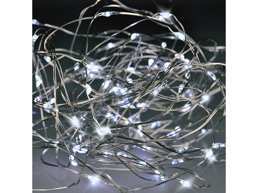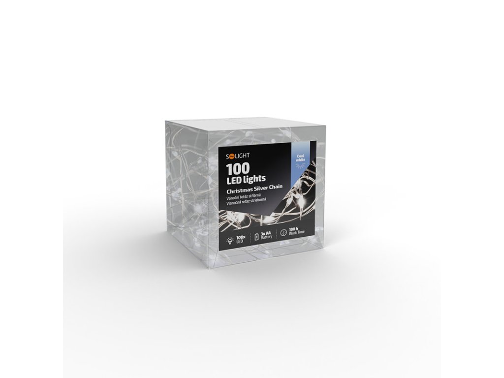 Solight vianočná reťaz strieborná, 100x mini LED, 10m, 3 x AA, studené svetlo