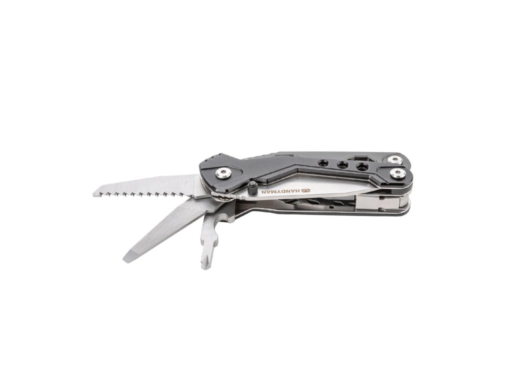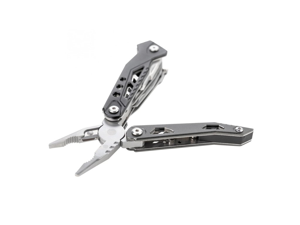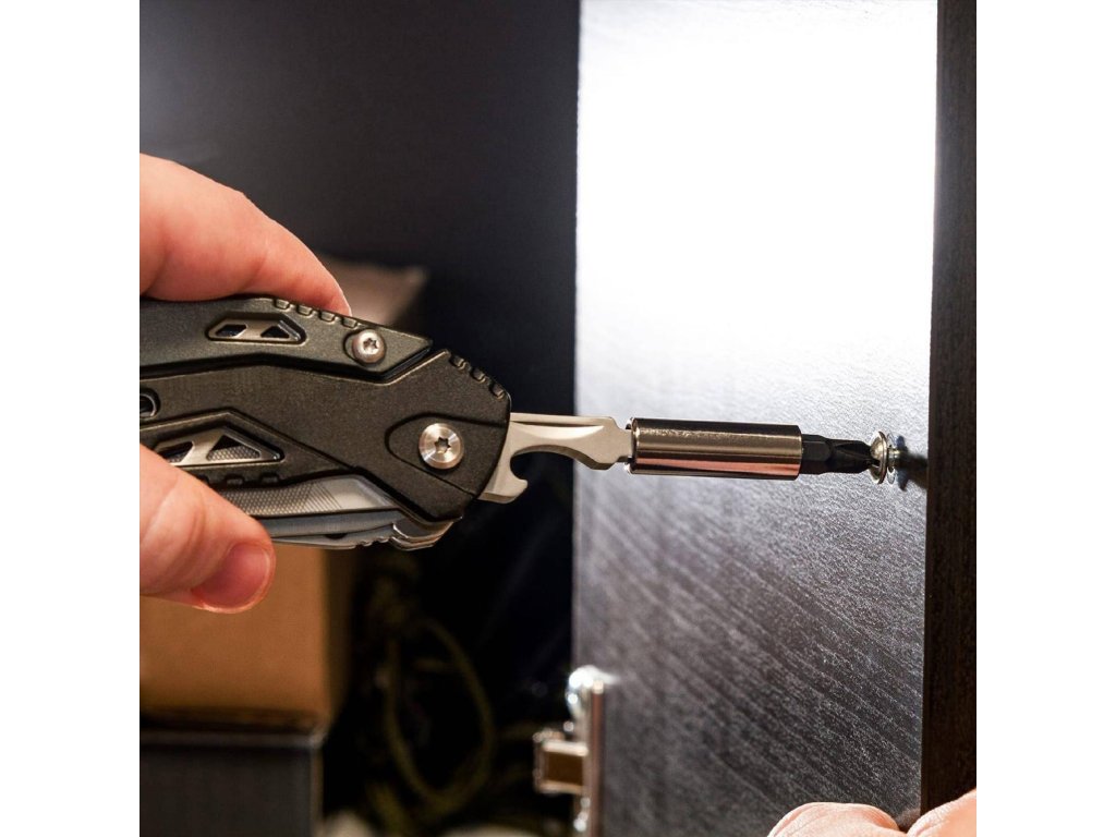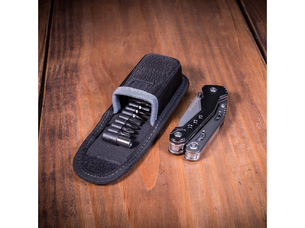 dokonalé ručné náradie, 18 funkcií v jednom pružinové nehrdzavejúce kliešte, štiepačka na drôt, plochý skrutkovač, pilník, krížový skrutkovač, pílka, otvárač na fľaše, 7 cm nôž s ozubením, magnetický držiak bitov a 9 druhov bitov #1, #2, és #3 Phillips, 1/8", 3/16" és 1/4" ploché, resp. H3, H4 a H5 šesťhranné hlavice kostra náradia z nehrdzavejúcej ocele ergonomická rukoväť z eloxovaného hliníkal praktické puzdro pre bityDodatočné parametre