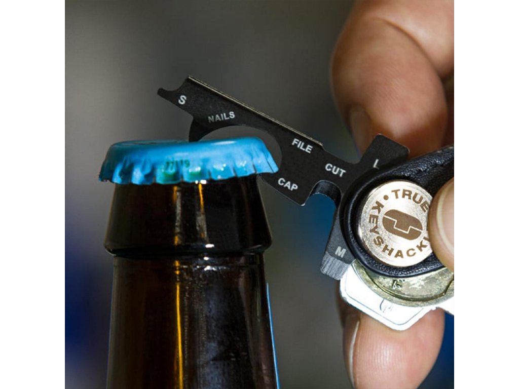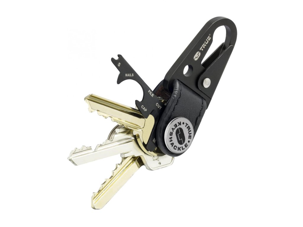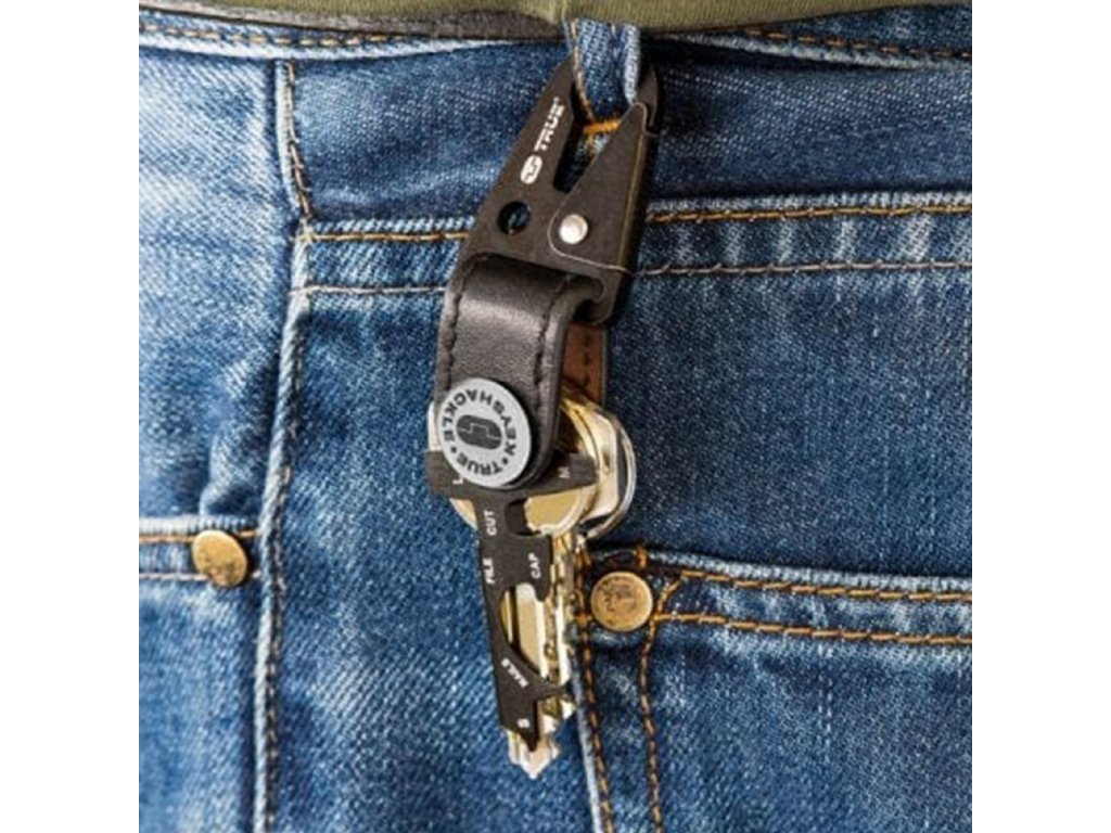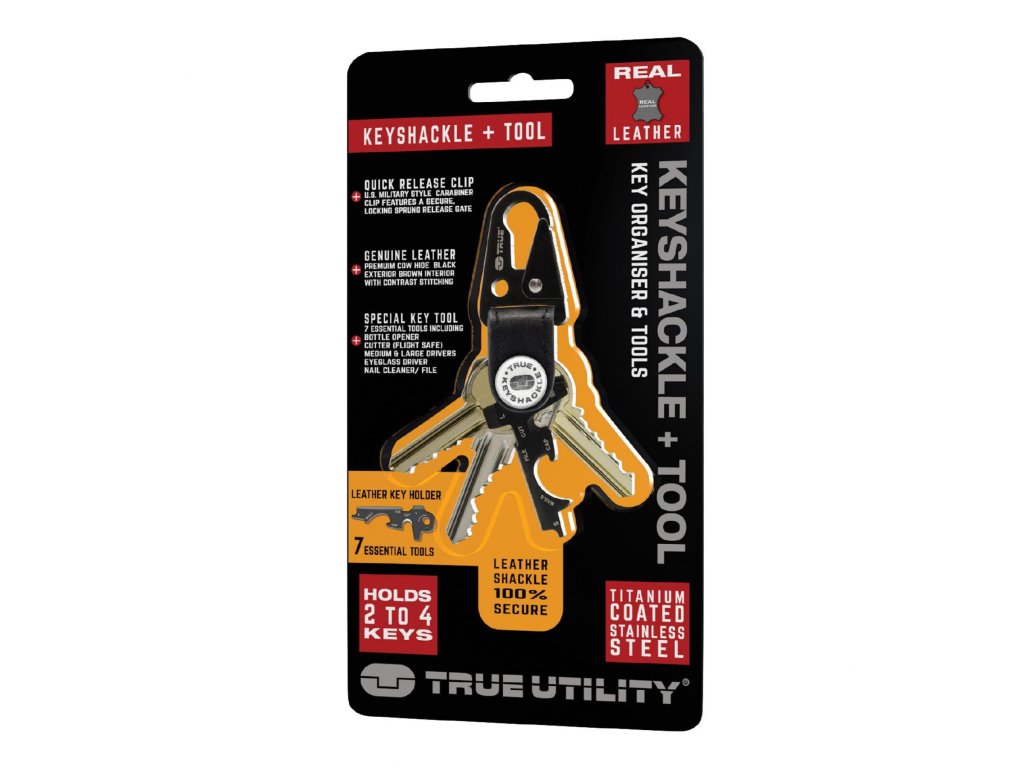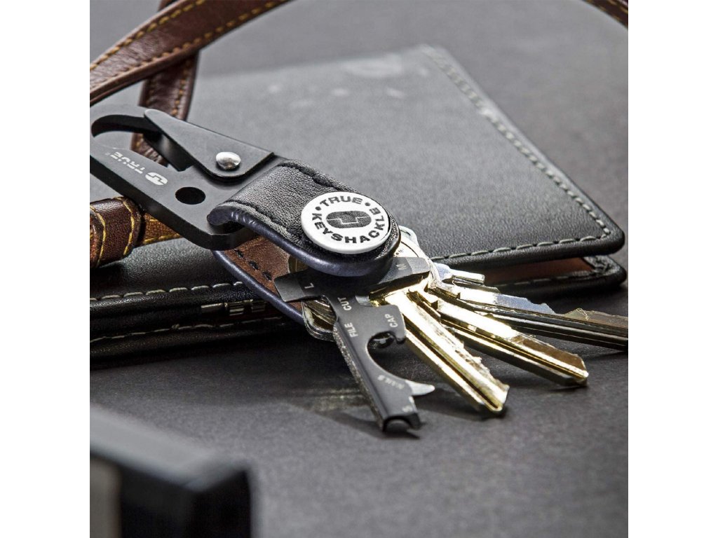 kožená kľúčenka s karabínou a multifunkčný nástroj 7 funkcií malý/stredný/veľký plochý skrutkovač, nástroj na odizolovanie, rezanie, čistenie nechtov, otvárač fľaše, pilník pre 2 - 4 kľúče remeň z pravej kože karabína potiahnutá vrstvou čierneho titánuDodatočné parametre