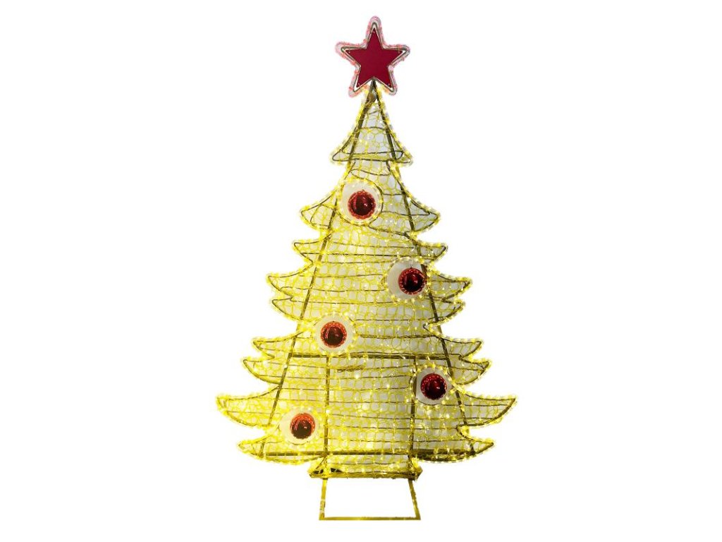 Elegantný dizajn a zlaté odtiene doplnené o červené gule s hviezdou na vrchole vytvárajú okúzlujúci vzhľad, zatiaľ čo LED svetielka pridávajú jemný lesk.