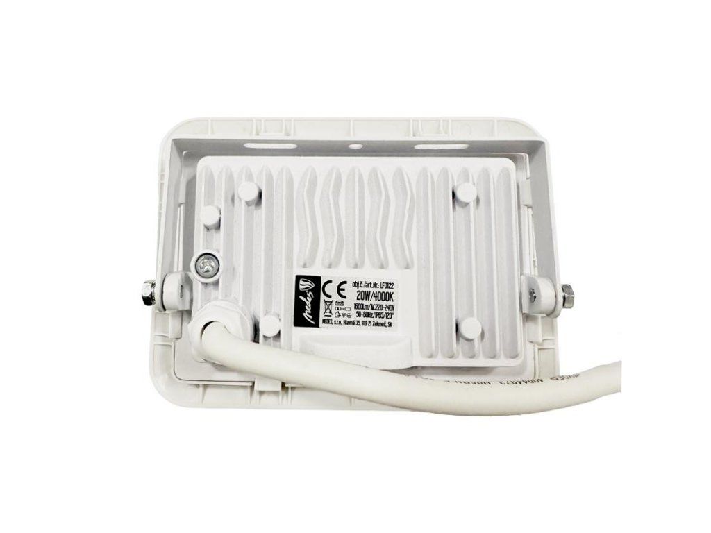 LED reflektor LF0122 v bielej farbe, s výkonom 20W, svietivosťou 1600Lm a farbou svetla 4000K disponuje držiakom a vysokokvalitným LED čipom.
